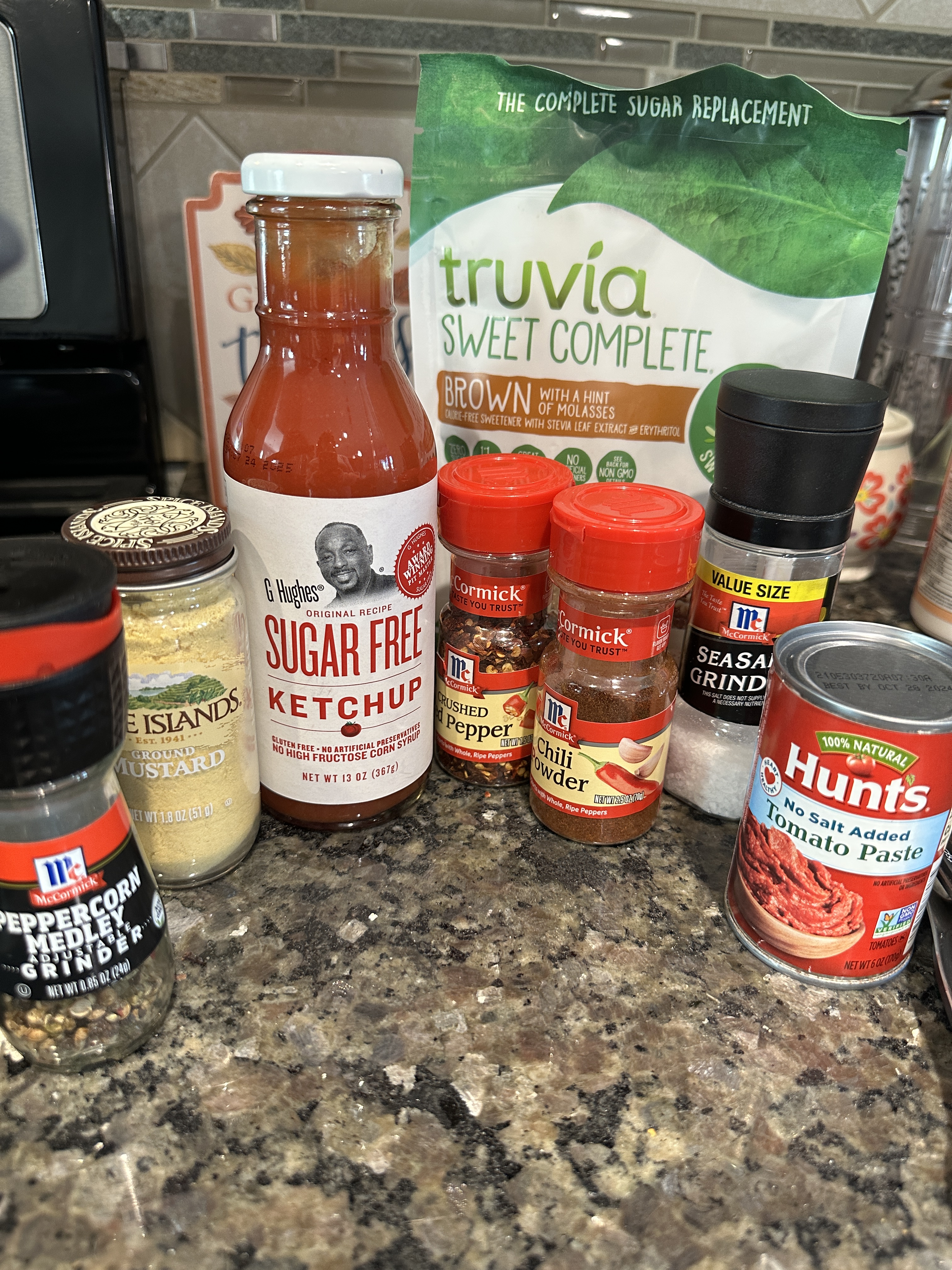 I use the G. Hughes Sugar-Free ketchup and Truvia Brown. I like G. Hughes Sugar-Free ketchup because it uses stevia, and I have found that for me, other non-sugar sweeteners are either too intense or give me headaches (I’m talking to you, aspartame). Truvia Brown is, obviously, stevia as well.