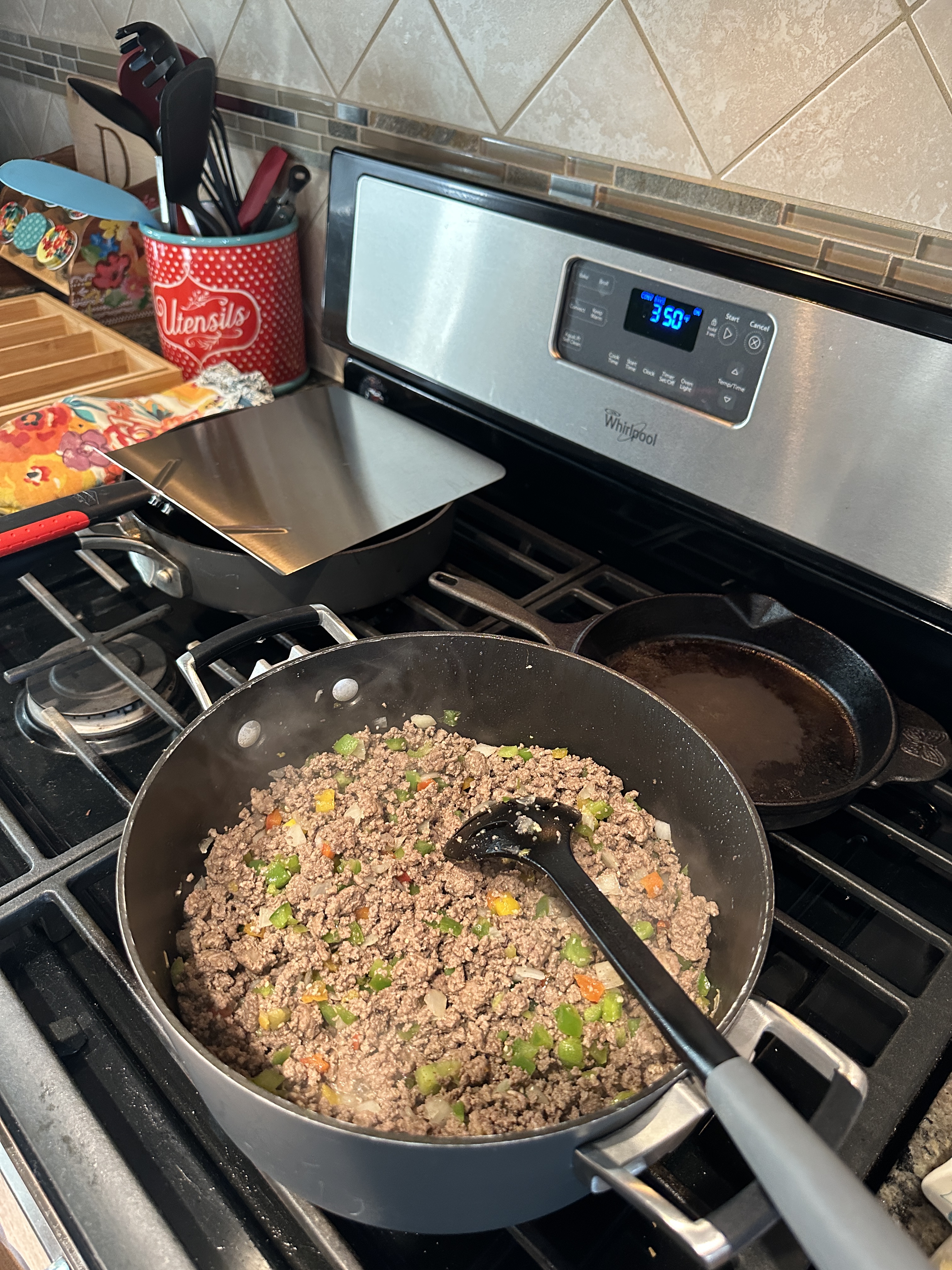 - Add the onion, bell pepper, and garlic and cook until slightly softened